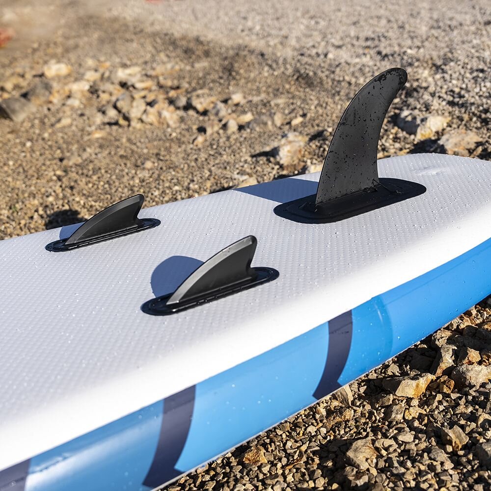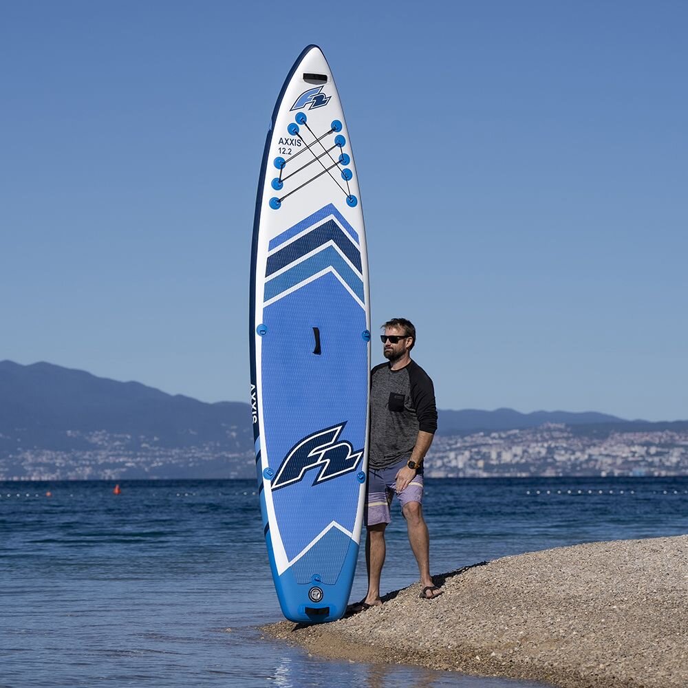 Model F2 Axxis combo w rozmiarze 10.5 to ciekawy zestaw dla osób szukających uniwersalności produktu i wielu zastosowań. Dlatego poza standardową możliwością pływania na stojąco z wiosłem, w zestawie combo mamy również siedzisko kajakowe oraz wiosło 2w1 które umożliwia szybką konfiguracje w wiosło dwu piórowe - kajakowe. Bardzo duży rozmiar deski - 320cm, szerokość 83cm oraz bardzo duża wyporność - 290l umożliwiają wykorzystanie jej jako deski rodzinnej, na która zmieścimy drugą osobę. Dopuszczalna maksymalna ładowność podawana przez producenta to 120kg ale my wiemy , że wytrzyma znacznie więcej... Jest niezwykle stabilna, dobrze trzyma kurs - dzięki zastosowaniu trzech finów - dwóch krótkich stałych oraz demontowanego w standardzie USbox.