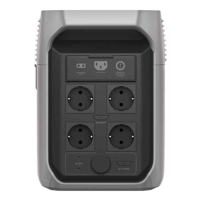 - Porty EU: 4× AC 230 V (Schuko), 2× USB-A, 2× USB-A Fast, 2× USB-C 100 W, gniazdo samochodowe 12.6 V/126 W, 2× DC5521.