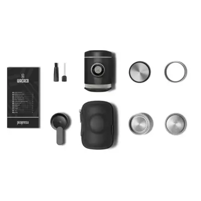 - Dostępne akcesoria: dodatkowe koszyki 12 g/18 g, stojak Picopresso, ręczny młynek WACACO Exagrind, waga Exagram.