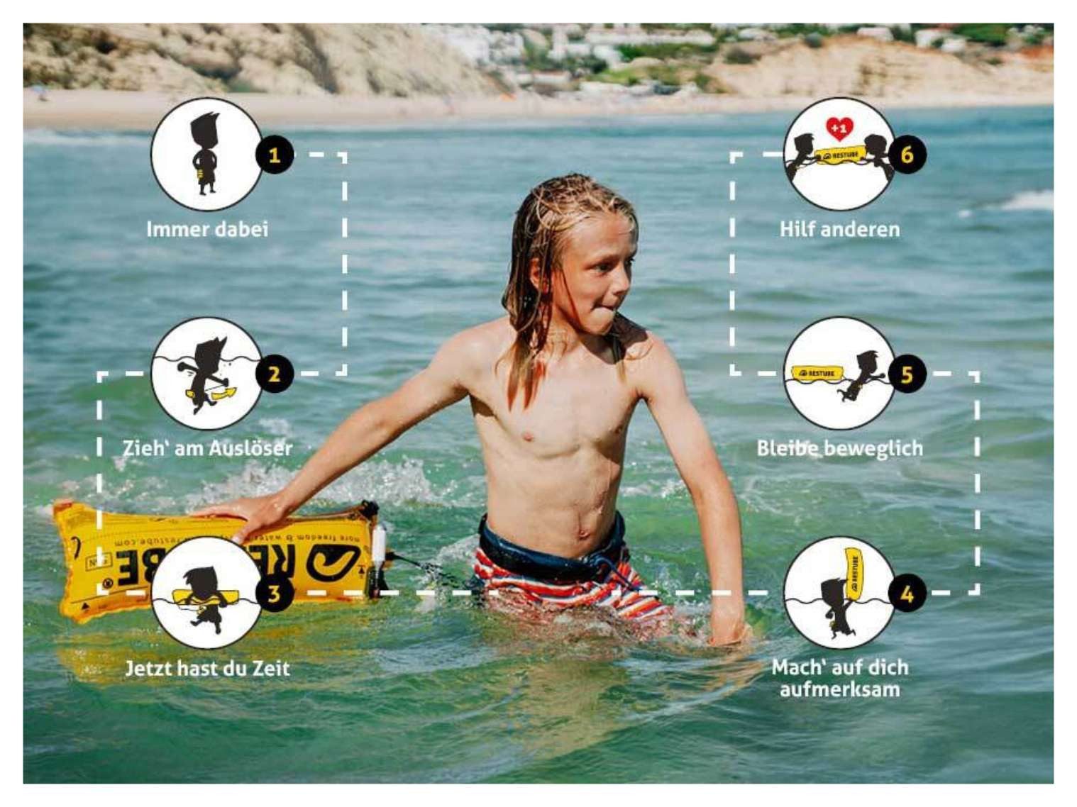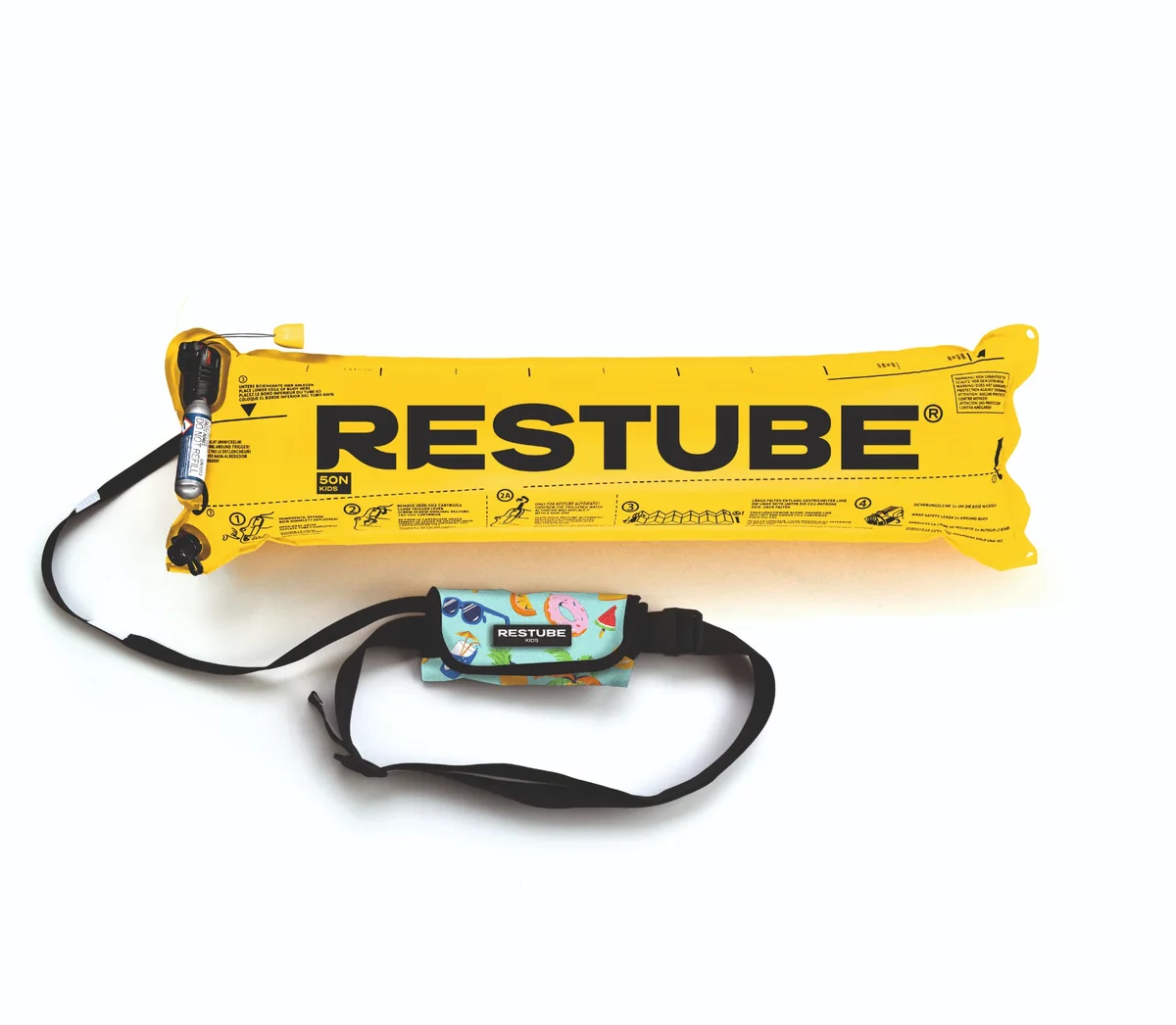 RESTUBE Kids Summer to kompaktowa bojka asekuracyjna dla dzieci, która zwiększa bezpieczeństwo podczas aktywności w wodzie, nie ograniczając przy tym swobody ruchu. Produkt jest schowany w niewielkiej saszetce noszonej wygodnie na pasie, a po pociągnięciu spustu błyskawicznie napełnia się powietrzem i tworzy widoczne, wypornościowe wsparcie.