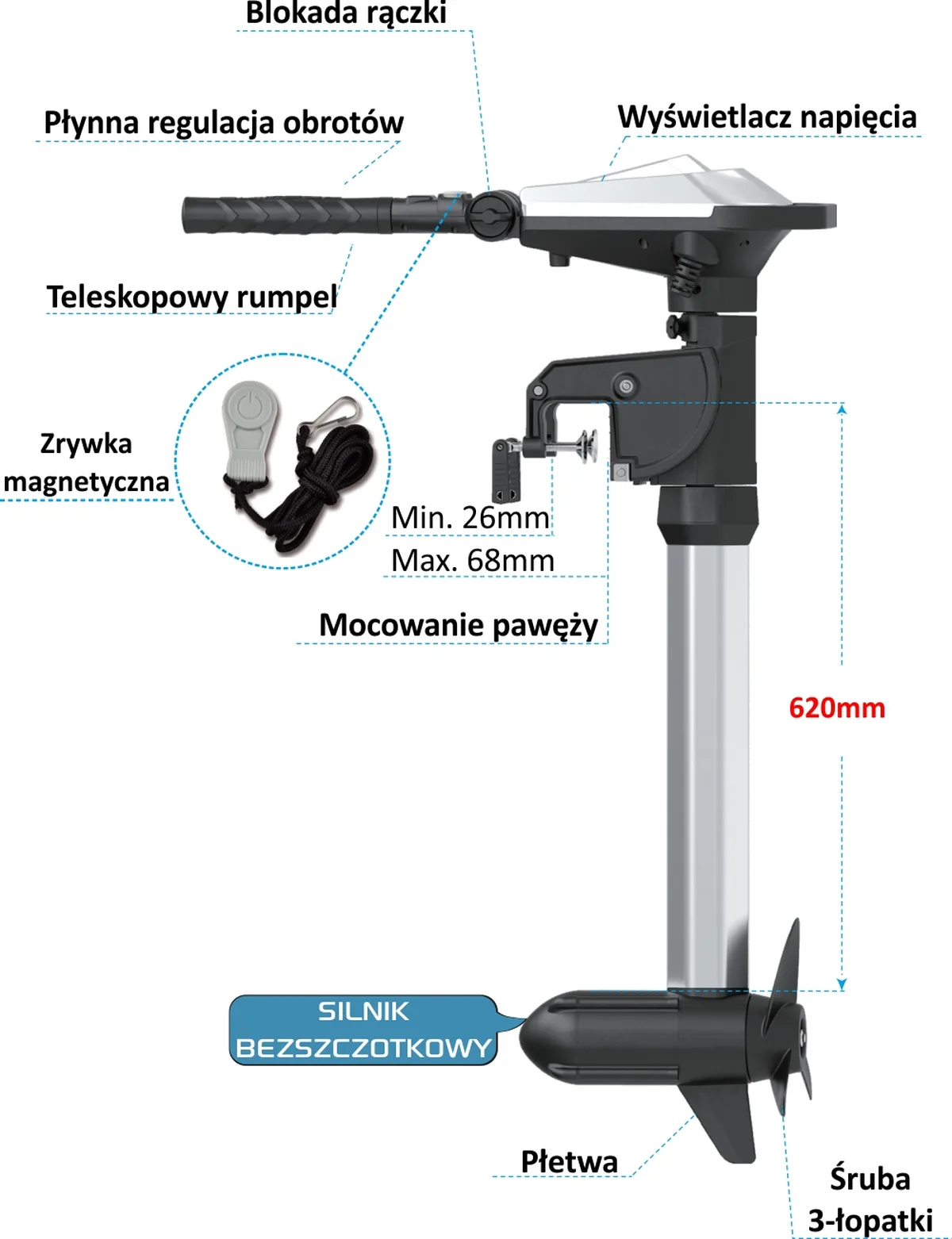 Silnik wyposażono w teleskopowy rumpel o regulowanej długości 35 cm. Rączkę można regulować do 180 stopni, co ułatwia sterowanie podczas pływania i poprawia wygodę transportu po złożeniu.