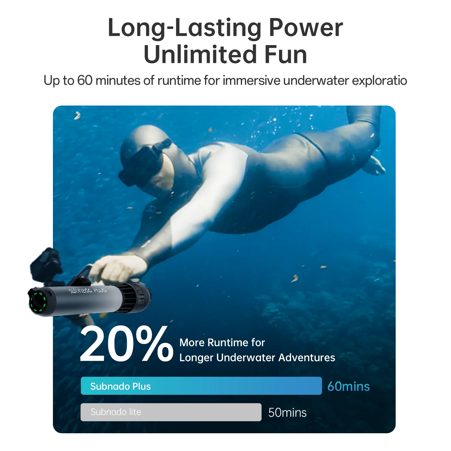 Subnado Plus to model dla użytkownika, który wie, że nie szuka już tylko lekkiego gadżetu do wakacyjnego snorkelingu. To bardzo dobra opcja, gdy zależy Ci na mocniejszym napędzie, większej rezerwie osiągów, bardziej sportowym charakterze użytkowania albo po prostu chcesz wejść poziom wyżej niż standardowy Subnado.